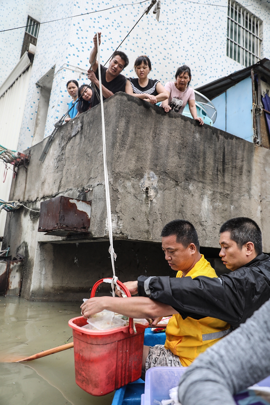 ????9月1日,潮陽區谷饒鎮華里社區,救援人員給被圍困的群眾送來了食物。