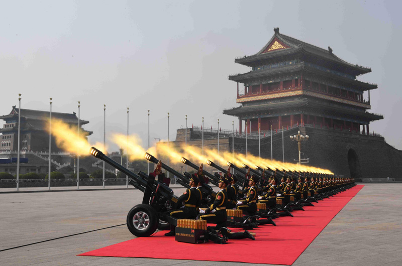 10月1日,慶祝中華人民共和國成立70周年大會在北京天安門廣場隆重舉行。 圖一:中共中央總書記、國家主席、中央軍委主席習近平發表重要講話并檢閱受閱部隊。這是習近平在天安門城樓上。 圖二:10月1日,慶祝中華人民共和國成立70周年大會在北京天安門廣場隆重舉行。 圖三:這是行進中的儀仗方隊。 圖四:這是禮炮鳴響。 圖五:這是"致敬"方陣。 圖六:這是東風-41核導彈方隊接受檢閱。 圖七:這是空中護旗梯隊。 圖八:這是氣球騰空而起。