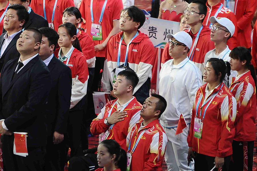 圖八: 8月25日,在全國第十屆殘運會暨第七屆特奧會開幕式的升國旗儀式上,一名殘疾運動員右手撫在心臟的位置,莊嚴地唱響國歌。本屆殘運會暨特奧會比賽規(guī)模和參賽人數(shù)均創(chuàng)歷屆之最,在我國首次實現(xiàn)全運會、殘運會暨特奧會同城成功舉辦。