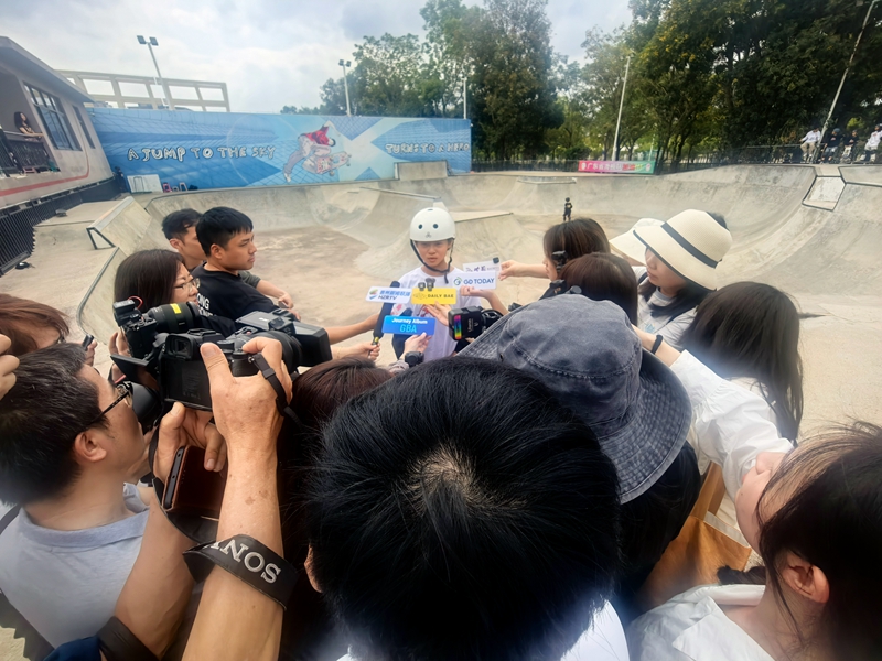 采访团在十五运会滑板场、滑轮场比赛场地惠州市体育运动学校采访巴黎奥运选手——12岁的滑板运动员郑好好。