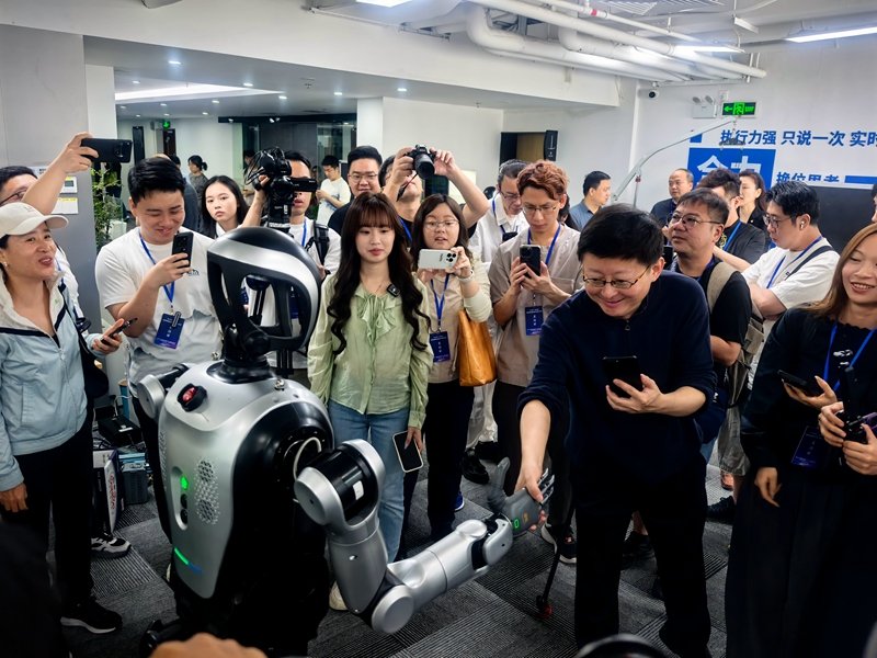 采访团成员在乐聚(深圳)机器人技术有限公司与机器人“夸父”握手互动。