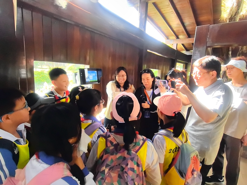 采访团在深圳福田红树林生态公园采访前来观鸟的小学生。